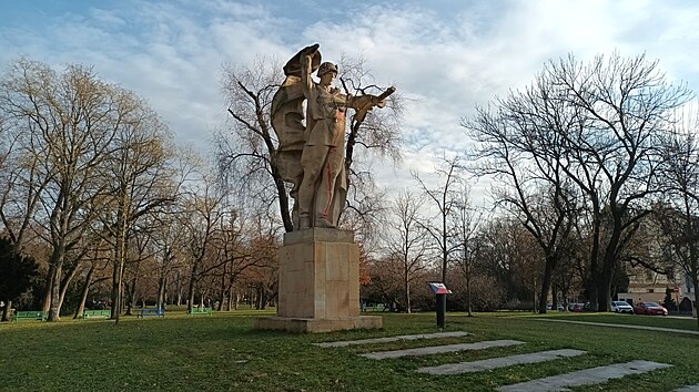 Socha sovětského vojáka v litoměřických Jiráskových sadech (prosinec 2024)