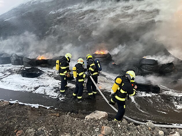 Hasiči likvidují požár pneumatik a pražců na skládce Celio u Litvínova. (2. listopadu 2024)