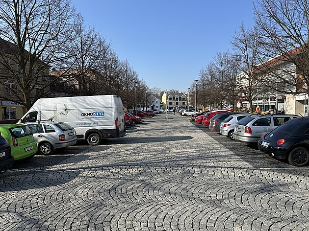 Náměstí Míru v Litvínově. V budoucnu by na něm mělo být méně parkovacích míst. (duben 2025)