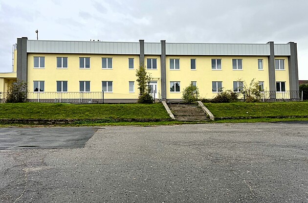 Objekt bývalé školky stojí vedle radnice v centru městečka Lom. Už je opravený. Město se rozhodlo vrátit státní dotaci. (říjen 2024)
