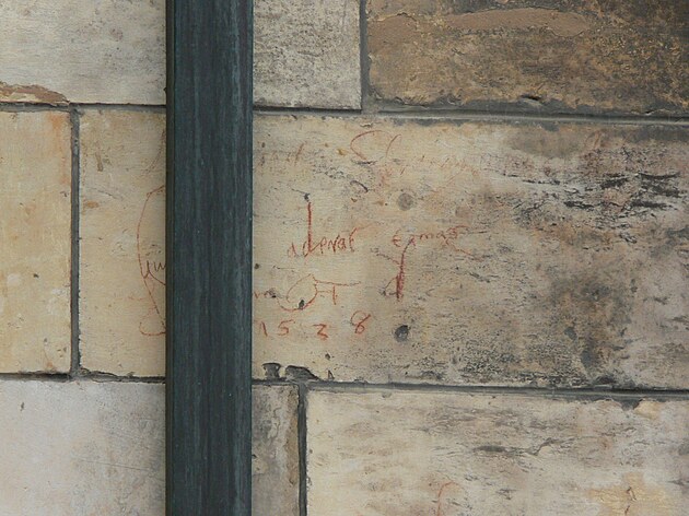 Sebeprezentační nápis na opěrném pilíři obsahující text Hic loco aderat tomass/A(nno) D(domini)/1538 (= toto místo navštívil Tomáš/léta páně/ 1538).