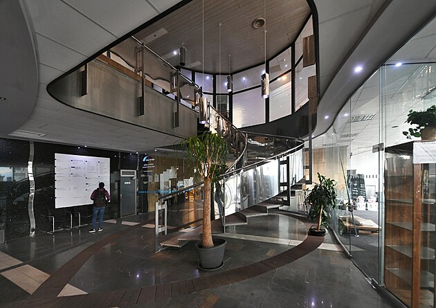 Vstupní hala mosteckého mrakodrapu SaS group Tower. Před lety prošla rekonstrukcí. „Nechtěli jsme dělat modernu. Pořád má nádech dob minulých,“ říká majitel budovy Josef Smolík. (duben 2025)