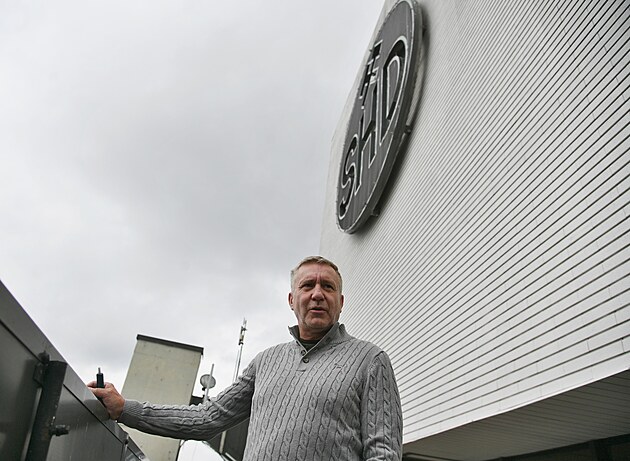 Majitel mosteckého mrakodrapu SaS group Tower Josef Smolík pod logem na střešní nástavbě, které odkazuje na skutečnost, že budova původně sloužila jako zázemí vedení Severočeských hnědouhelných dolů. (duben 2025)