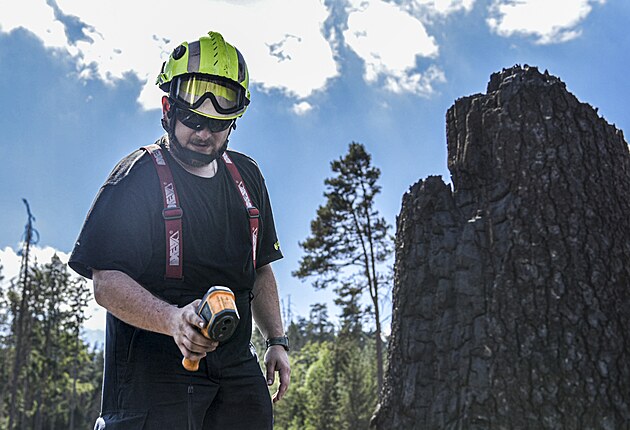 Správci Národního parku dnes převzali zpět do vlastních rukou část území (sektor 4). Tento úsek pomáhají strážit dobrovolní hasiči z Křešice. Díky nepřístupnosti terénu musí hasiči obcházet místo pěšky. Během chůze detekují termokamerou povrch a zjišťují, kde by se mohlo vyskytnout nové ohnisko. (8. srpna 2022)