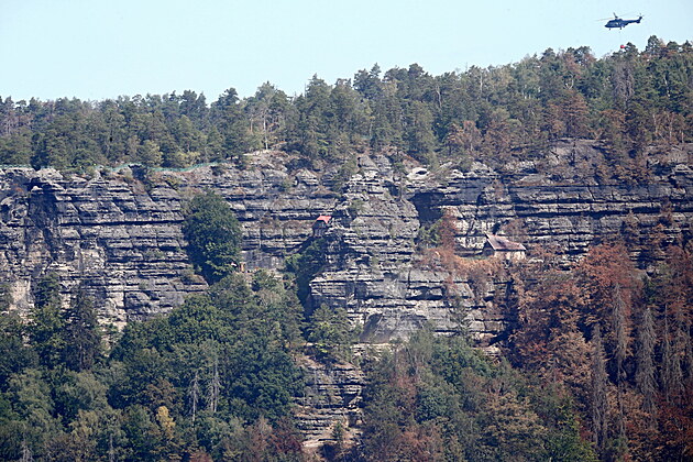 Pohled z janovské rozhledny na Pravčickou bránu. Na snímku je vidět i vrtulník s bambi vakem. (6. srpna 2022)