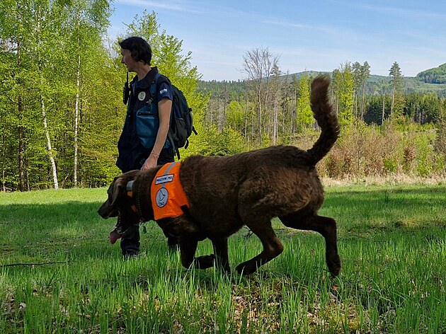 Psovodka Klára Hlubocká se svými dvěma svěřenci na území Národního parku České Švýcarsko. (květen 2025)