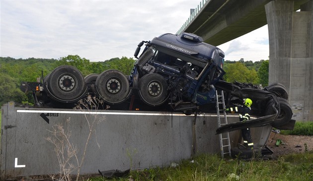 Nehoda se stala na konci května u obce Velemyšleves, na mostě, po kterém vede silnice I/27 k dálnici D7. Kamion spadl z patnáctimetrové výšky pod most. Návěs s pískem skončil koly vzhůru, na něj dopadl tahač.
