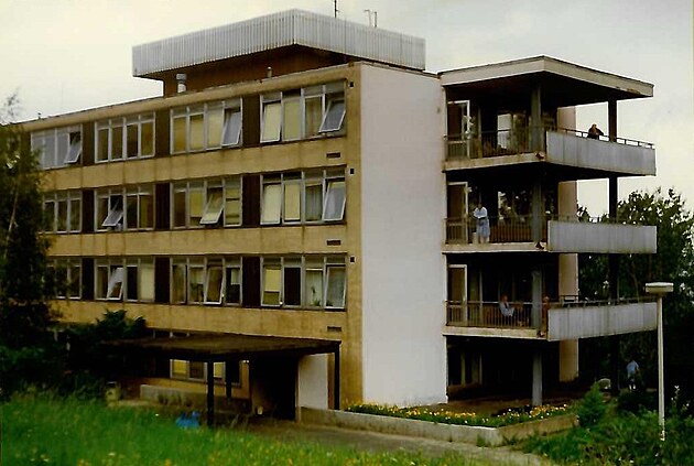 Budova E (plicní pavilon) mostecké nemocnice na historickém snímku