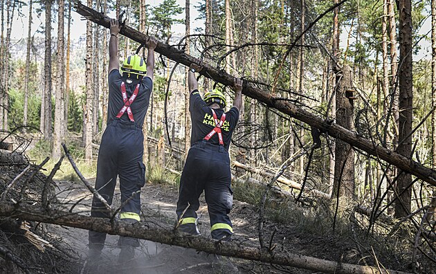 Správci Národního parku dnes převzali zpět do vlastních rukou část území (sektor 4). Tento úsek pomáhají strážit dobrovolní hasiči z Křešice. Díky nepřístupnosti terénu musí hasiči obcházet místo pěšky. Během chůze detekují termokamerou povrch a zjišťují, kde by se mohlo vyskytnout nové ohnisko. (8.srpna 2022)