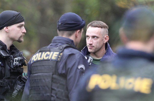 Obviněný Martin Ch. při rekonstrukci vraždy na chalupě v Doubici.