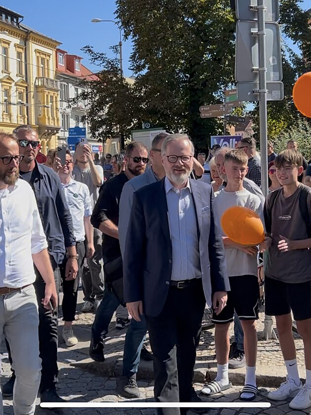 Premiér Petr Fiala (ODS) prochází mezi svými příznivci i odpůrci při předvolebním mítinku v Českých Budějovicích. (1. září 2025).