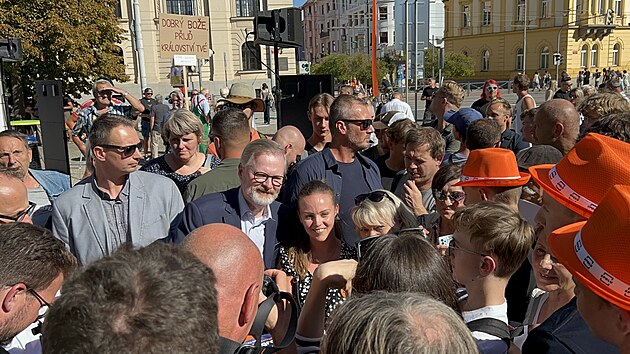 Premiér Petr Fiala (ODS) prochází mezi svými příznivci i odpůrci při předvolebním mítinku v Českých Budějovicích. (1. září 2025).