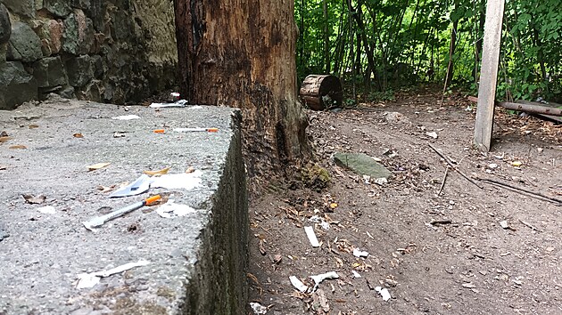 Areál bývalé plovárny v Zámecké zahradě v Teplicích. Aktuálně zdevastovaný areál, v jehož zákoutích se schází uživatelé drog. (červenec 2025)