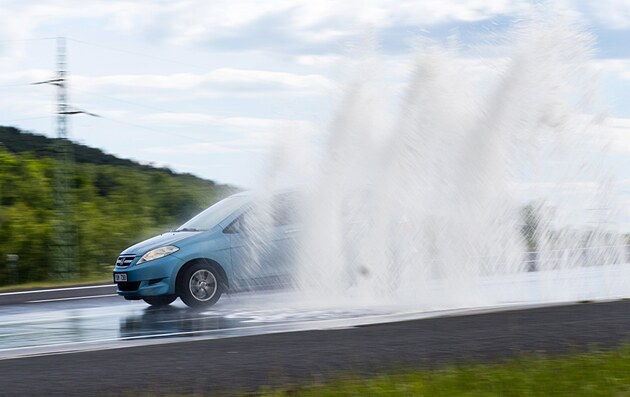 Výcvik účastníků Kurzu for TEEN na polygonu mosteckého autodromu. Vodotrysky se spustí na náhodné straně, takže na kluzké vozovce musí řidič bleskově zareagovat, aby se vyhnul.