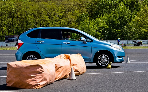 Výcvik účastníků Kurzu for TEEN na polygonu mosteckého autodromu. Vyhýbání se překážce