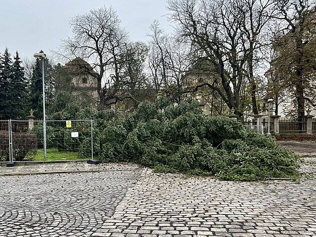 V Postoloprtech na Lounsku pokáceli jedli, kterou tu desítky let zdobili jako vánoční strom. (14. listopadu 2024)