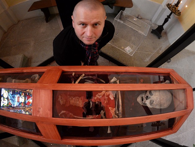 Skleněná rakev s téměř kompletní kostrou mučedníka ze 4. století čeká na své znovuobjevení v přítmí boční kaple kostela.