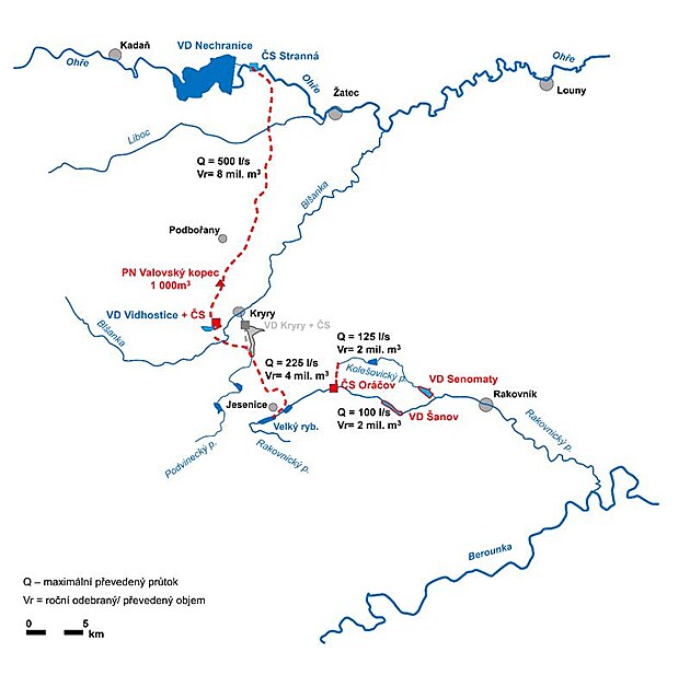 Plánované přivaděče dopraví vodu z Ohře přes nádrž Vidhostice do povodí Blšanky a dále do Velkého rybníka v Jesenici v povodí Rakovnického potoka.