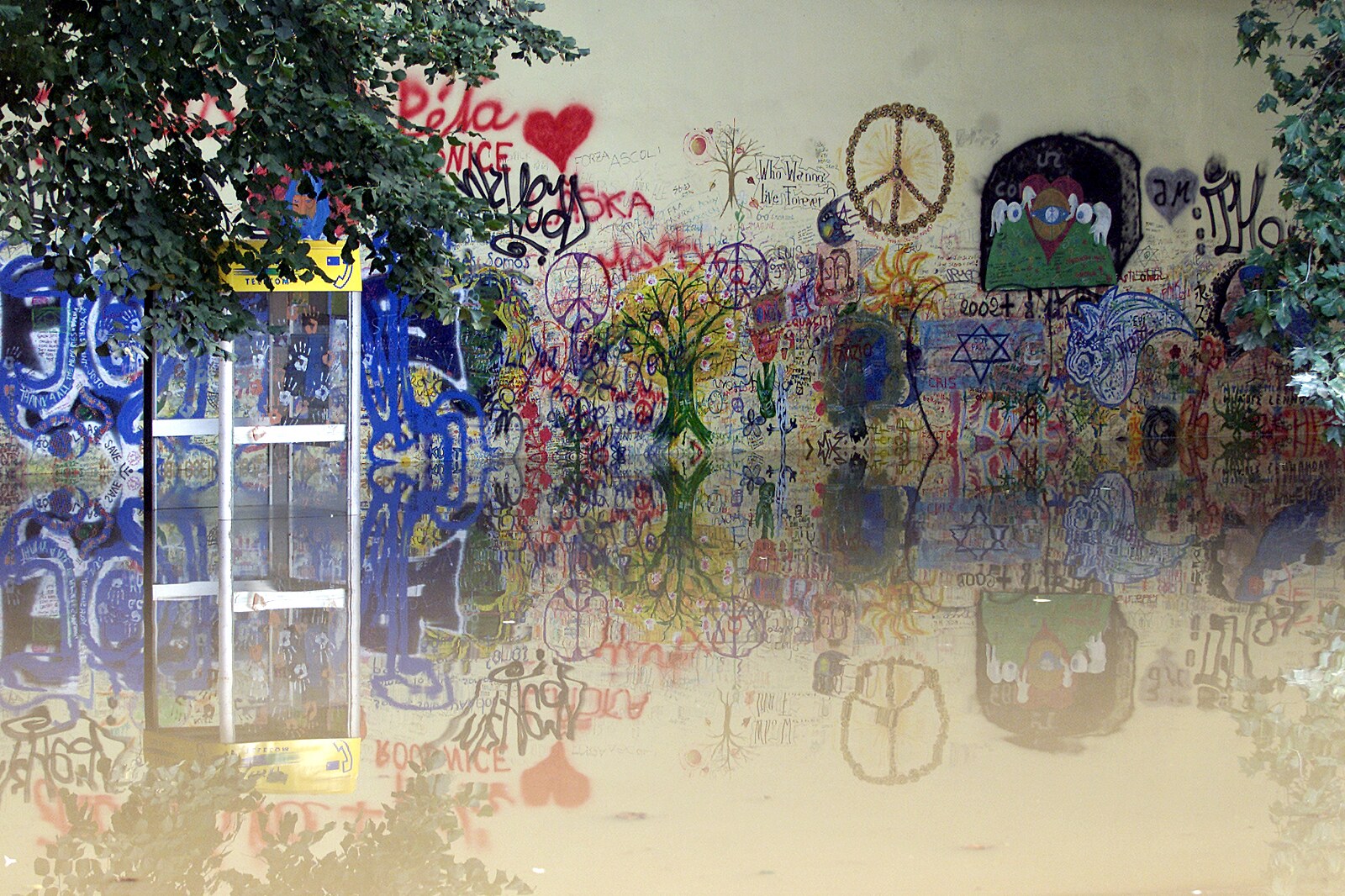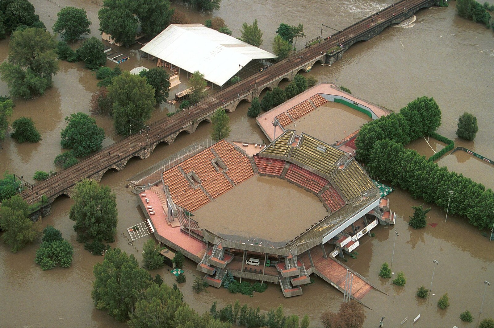 Praha, ostrov Štvanice. Zatopený Centrální tenisový dvorec. Povodně 2002.