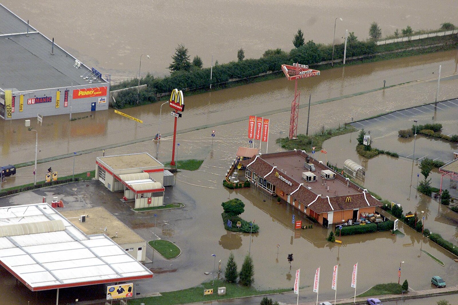 Povodeň v Českých Budějovicích, na snímku zatopená restaurace McDonald. Povodně 2002.
