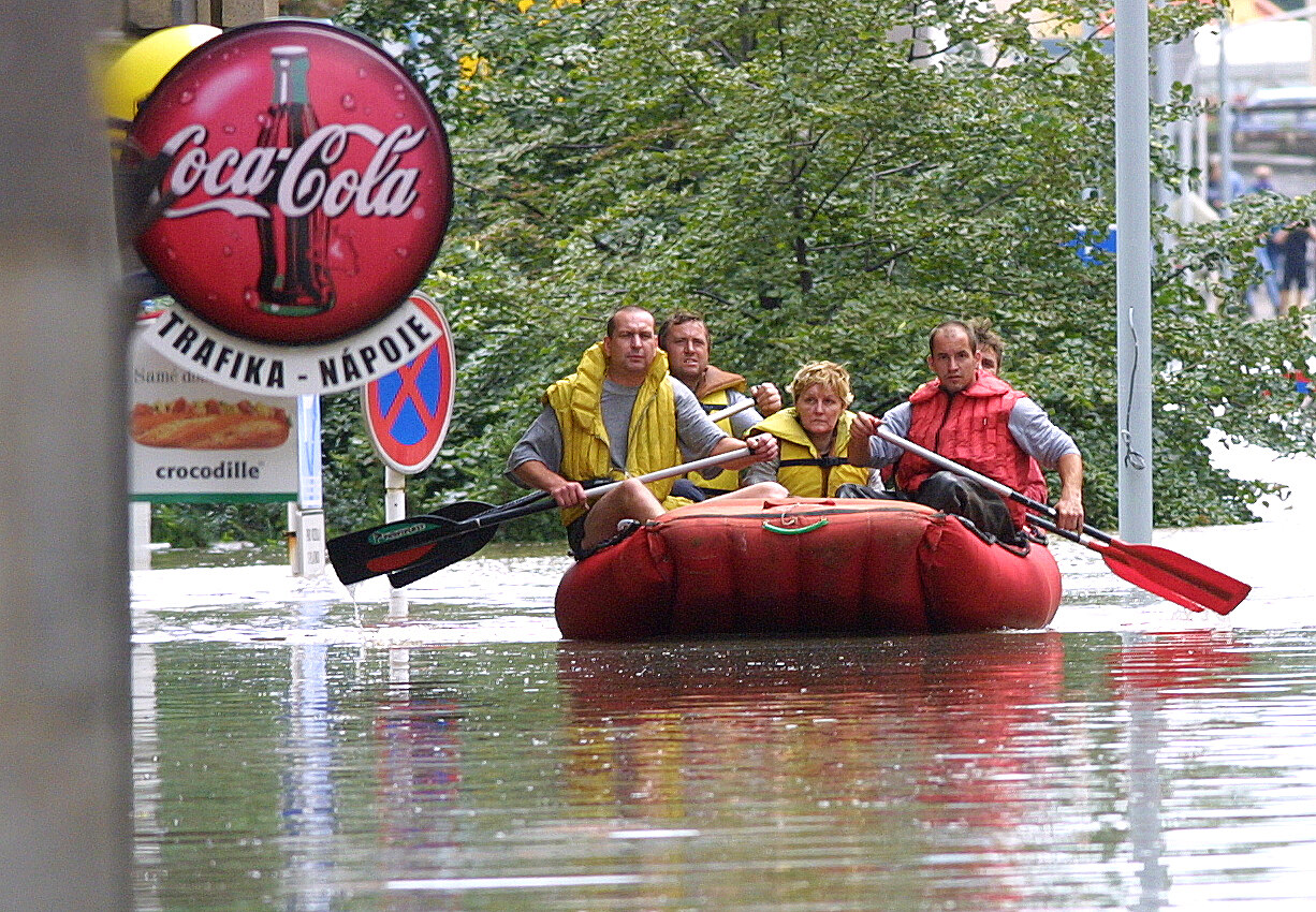 Záchranáři na člunu plují Klimentskou ulicí v Praze. Povodně 2002.