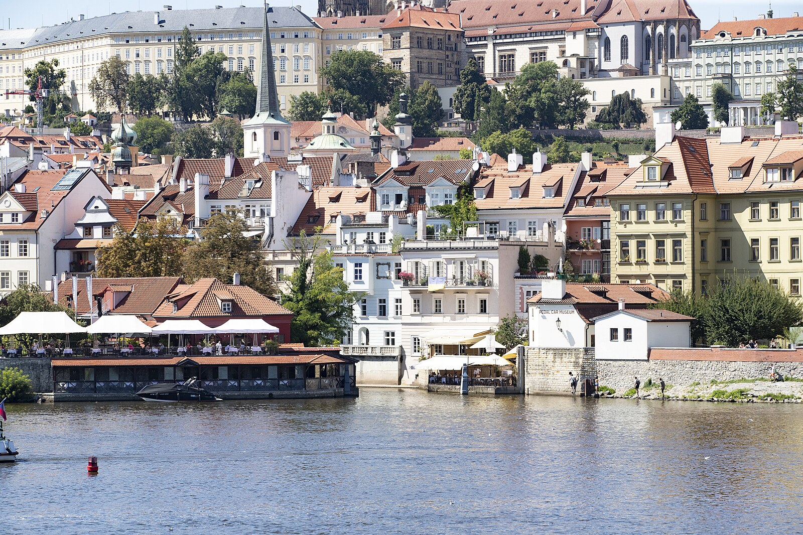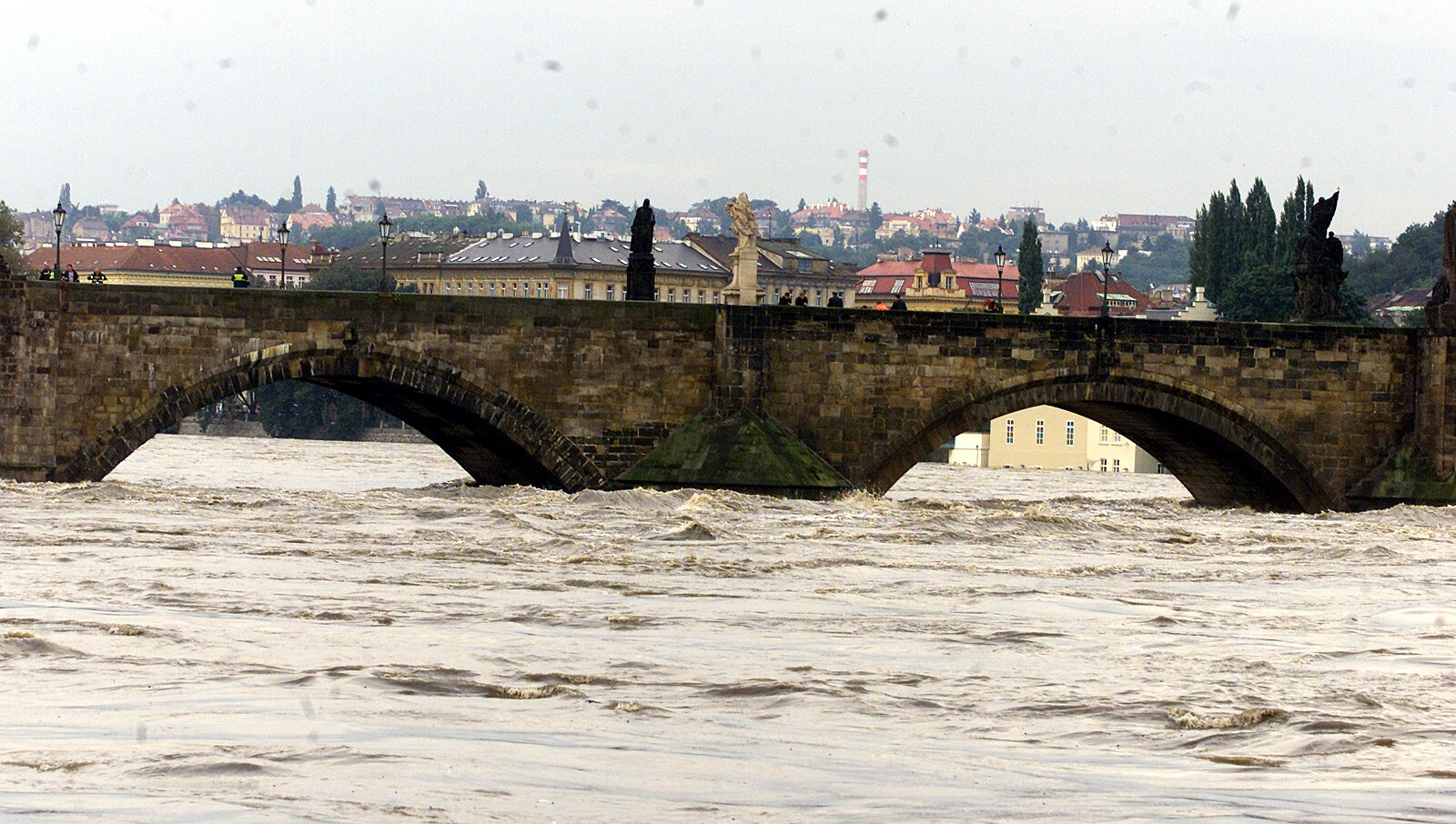 Pražské mosty a střecha Strakovy akademie. Povodně 2002.