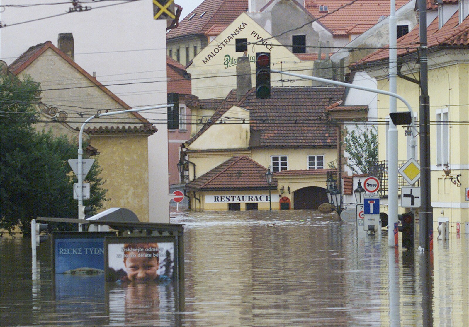 Zatopená křižovatka na Klárově v Praze. Povodně 2002.