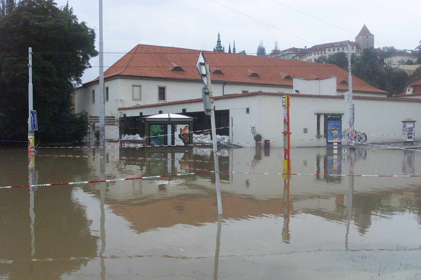 Zatopená tramvajová zastávka na Klárově v Praze. Povodně 2002.