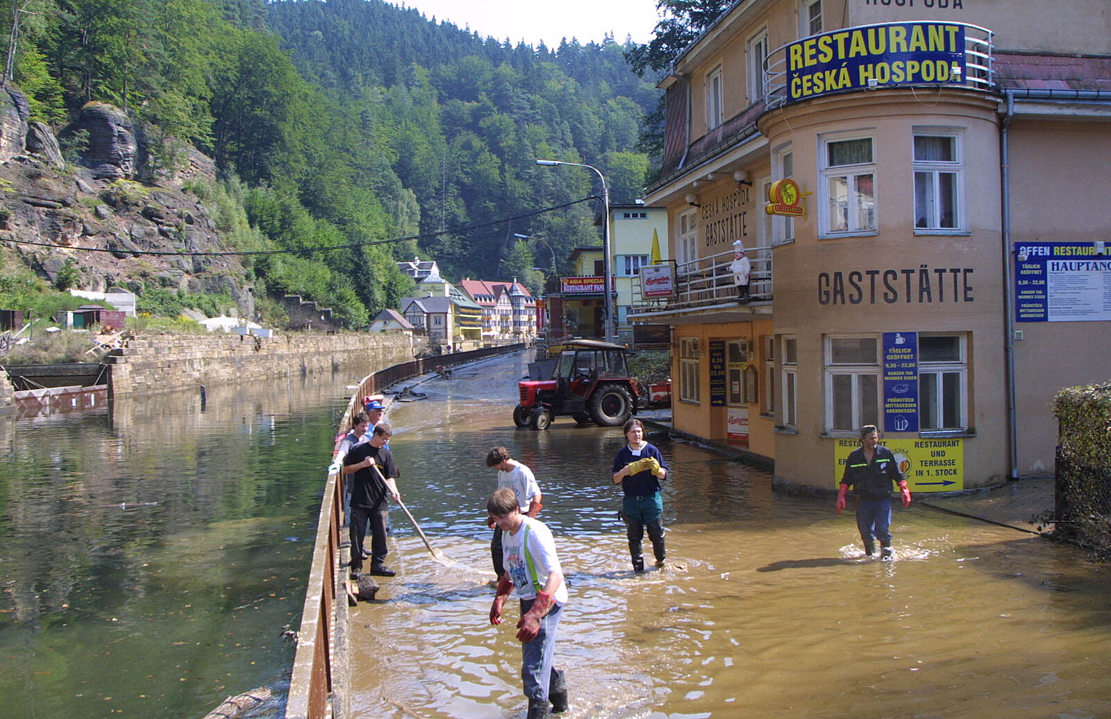 Úklid po záplavách v obci Hřensko před hotelem Česká hospoda. Povodně 2002.