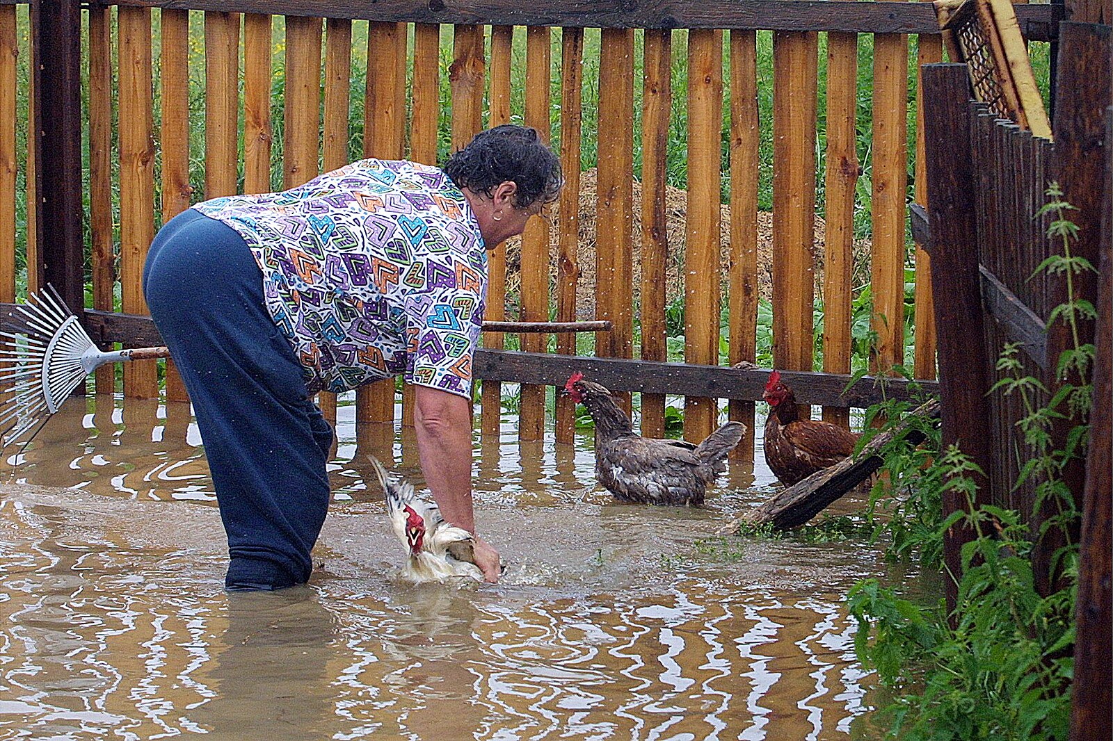 Paní Marie Horková zachraňuje na zahradě svého domku ve Sviněticích na Strakonicku slepice z rozvodněného potoka. 16. července 2002.