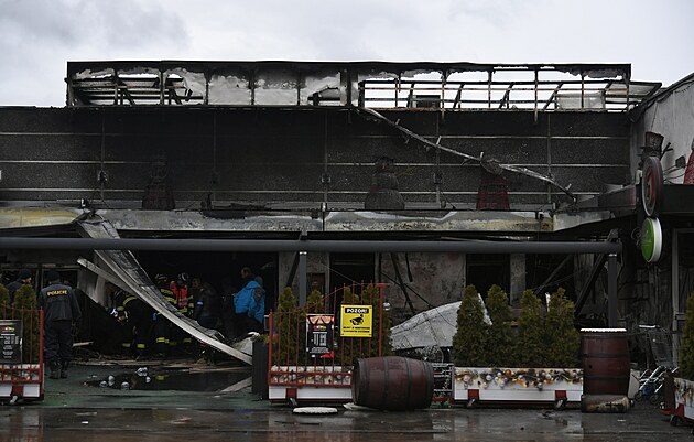 Vyhořelá pizzerie PamPam v Ústí nad Labem. Na místě jsou vyšetřovatelé policie i hasičů. Pátrají po příčině. (2. ledna 2025)