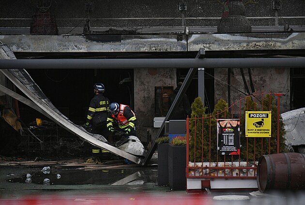 Vyhořelá pizzerie PamPam v Ústí nad Labem. Na místě jsou vyšetřovatelé policie i hasičů. Pátrají po příčině. (2. ledna 2025)
