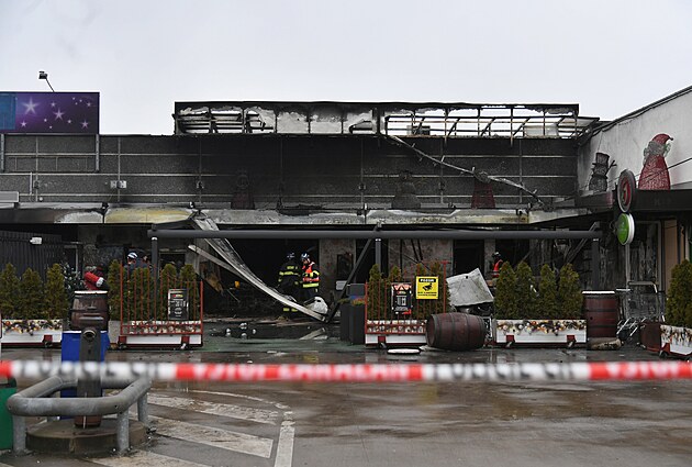 Vyhořelá pizzerie PamPam v Ústí nad Labem. Na místě jsou vyšetřovatelé policie i hasičů. Pátrají po příčině. (2. ledna 2025)