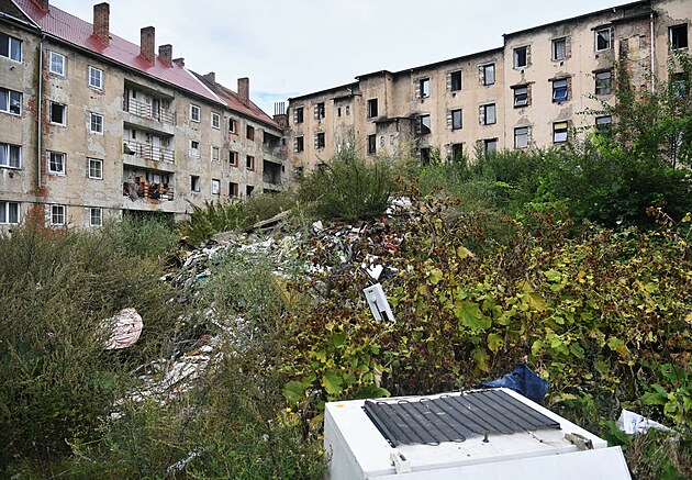 Čtvrť Předlice v Ústí nad Labem. Dům v ulici Sklářská. Všude je odpad. (19. srpna 2024)