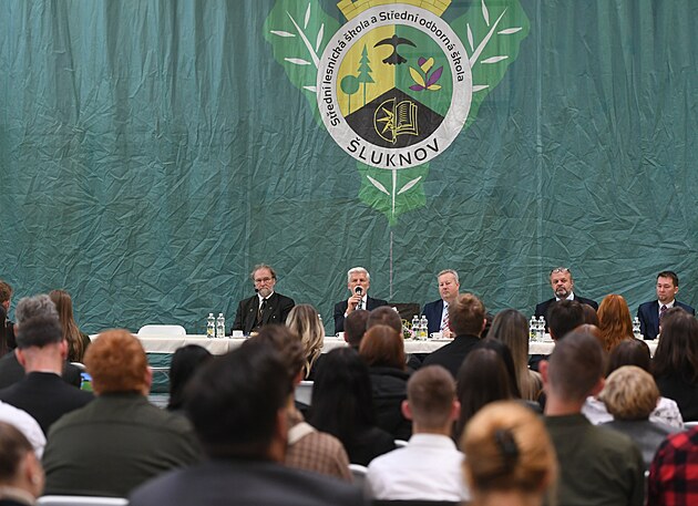 Prezident Petr Pavel při debatě se žáky Střední lesnické školy a Střední odborné školy ve Šluknově. (14. října 2025)