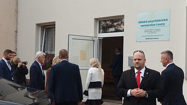 Prezident Petr Pavel s první dámou při příjezdu k Dětské psychiatrické nemocnici Louny (15. října 2025)