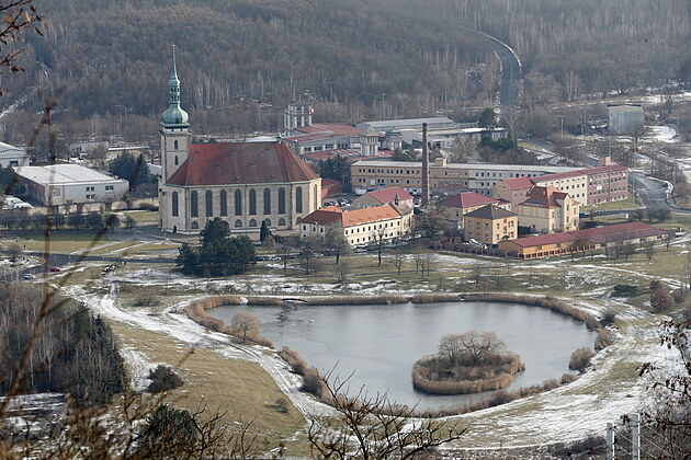 Přesunutý mostecký kostel a kolem něj sklady a fabriky