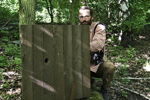 V nedávno vzniklém ptačím parku Střimická výsypka na Mostecku ornitologové vytyčili první návštěvnický okruh. Na snímku ornitolog Václav Beran (červen 2025)
