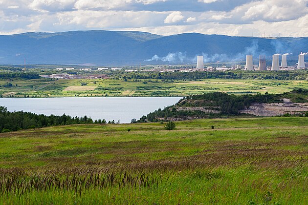 Střimická výsypka. Pohled na jezero Most. V pozadí litvínovská chemička