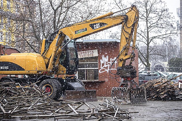 Demolice objektů na Tržním náměstí v Teplicích, které sloužily jako zázemí pro trhovce. (únor 2023)