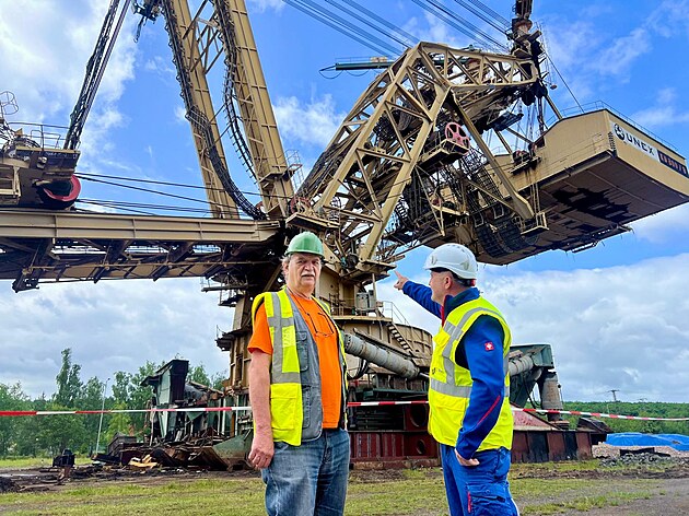 Rypadlo přezdívané Březenský drak krátce před odstřelem. (zleva) Petr Mikula, technický vedoucí odstřelu, a Martin Miller z firmy Kovodemont Czech. (6. června 2025)