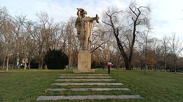 Socha sovětského vojáka v litoměřických Jiráskových sadech (prosinec 2024)