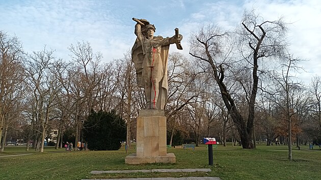 Socha sovětského vojáka v litoměřických Jiráskových sadech (prosinec 2024)
