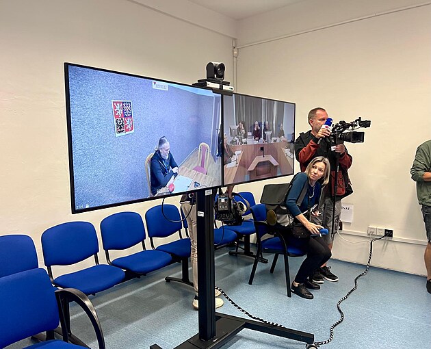 Jednání Okresního soudu v Mostě o propuštění dvojnásobného vraha Zdeňka Vocáska probíhá videokonferenčně. Snímek je pořízený těsně před zahájením jednání. Na obrazovkách tedy zatím není Vocásek. Během samotného jednání novináři obrazové záznamy pořizovat nesmí. (17. září 2025)
