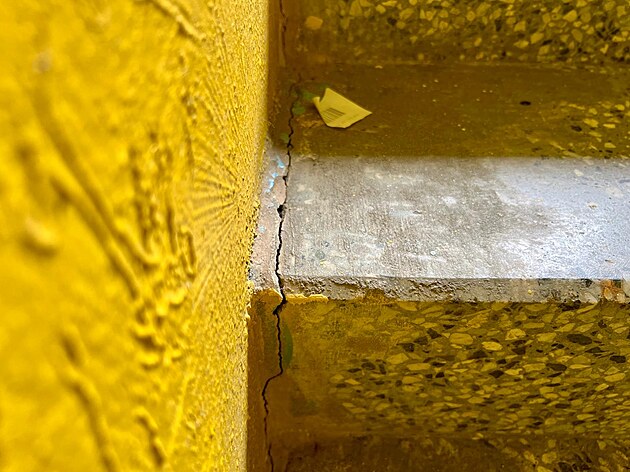 Prasklina na chodbě v části domu, která nebyla evakuována. (28. srpna 2025)