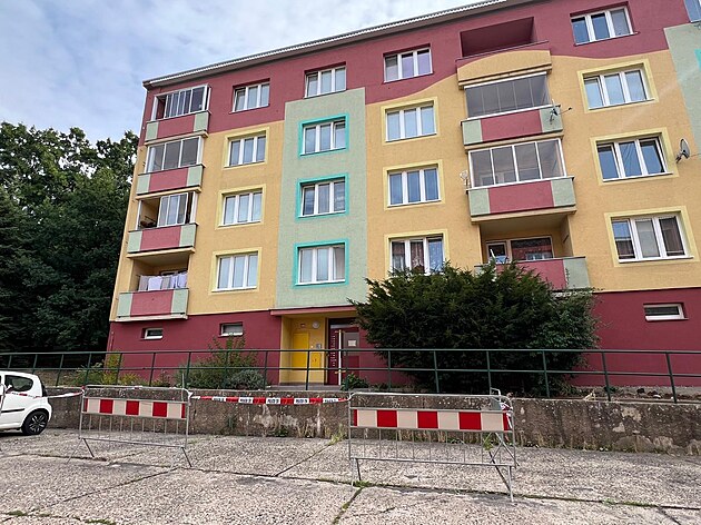 Kolem vchodu, ve kterém nyní nikdo nesmí být, rozmístili zábrany, aby do jeho blízkosti nikdo nevstupoval. (28. srpna 2025)