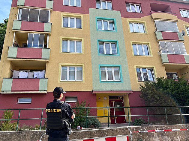 Policista hlídkuje u vchodu, aby se k němu nikdo nepřibližoval. (28. srpna 2025)