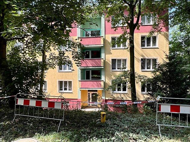Vchod domu, jehož obyvatelé museli kvůli narušené statice pryč, je obehnaný zábranami. (28. srpna 2025)