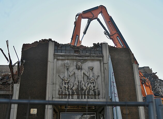 Reliéf s Neptunem na demolované budově Vrbenského lázní v Ústí nad Labem (6. března 2025)