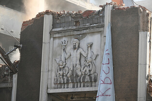 Reliéf s Neptunem na demolované budově Vrbenského lázní v Ústí nad Labem (6. března 2025)
